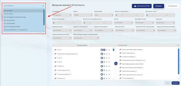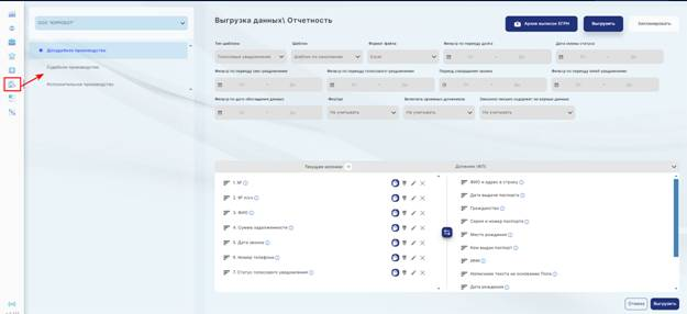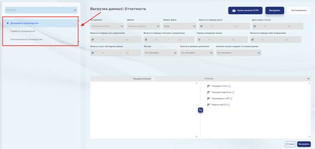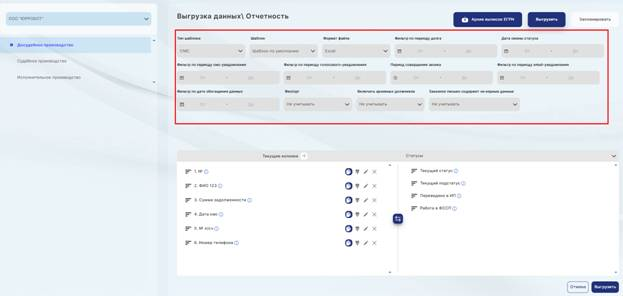 Для успешной выгрузки данных система предлагает несколько видов стандартных шаблонов отчетов в зависимости от выбранного типа производства (досудебное, судебное, исполнительное).