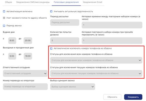 oСтатусы для исключения всех номеров телефона из обзвона. Все номера – это номера всех должников из списка, подходящих под критерии настройки суммы для автоматической отправки / формирования уведомлений, описанные в разделеНастройка автоматизации.