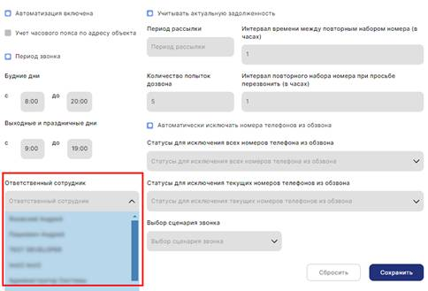 ·Ответственный сотрудник -сотрудник, отвечающий за общение с должниками при переводе звонка на оператора. Выбирается сотрудник компании из выпадающего списка сотрудников компании. (Рис.4)