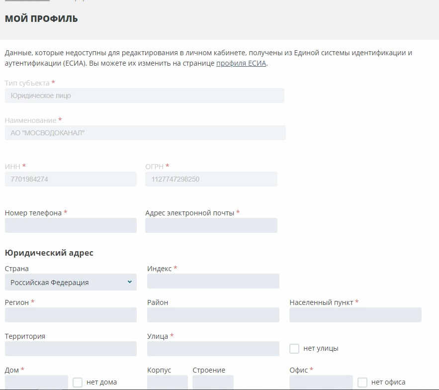 В разделе «Общая информация» представлена информация об организации, которая заполняется автоматически из данных, полученных из Единой системы идентификации и аутентификации (ЕСИА). Вы можете их изменить на странице профиля ЕСИА (Рис.1) (Рис.2). Остальные поля необходимо заполнить самостоятельно.