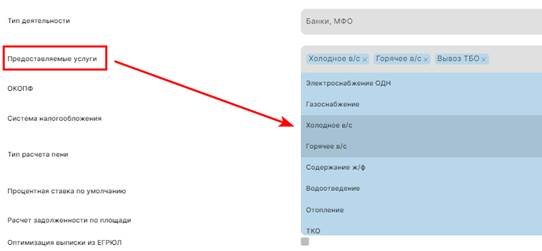 ·Предоставляемые услуги– из выпадающего списка нужно выбрать одну или несколько услуг, предоставляемых компанией. Услуги необходимо выбирать для дальнейшего гибкого использования и применения в шаблонах документов. Если нужной услуги не оказалось в списке и требуется добавить новую, можно написать в чат технической поддержки или на электронную почтуhelp@urrobot.tech(Рис.9)