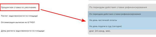 Процентная ставка по умолчанию- выпадающий список содержит типы ставок по расчету пени для проведения расчётов по должникам. (Рис.12)