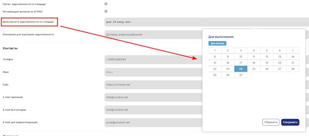 ·День расчета задолженности по площади– выбор из календаря дня месяца, с какого будет начинаться расчет задолженности для поля «Расчет задолженности по площади» (Рис.14)
