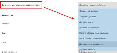 ·Основание взыскания задолженности- выпадающий список с типами документов/договоров, на основании которых осуществляется взыскание задолженности у должников. Заполняется только для работы с юридическими лицами в арбитражном суде. (Рис.15)