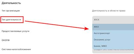 ·Тип деятельности- содержит информацию по сферам деятельности организации. Из выпадающего списка нужно выбрать тип деятельности организации (Рис.8)
