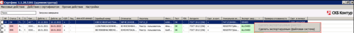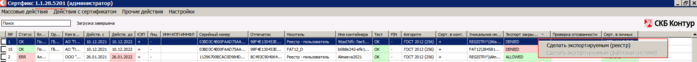 Запустите “CertFix“, после чего загрузится список сертификатов. Напротив строки «Поиск» появится информация «Загрузка завершена». Дальше нужно зажать клавишу “Shift” на клавиатуре и правой кнопкой мыши кликнуть по нужному контейнеру, у которого в колонке "Экспорт закрытого ключа" стоит значение "DENIED".