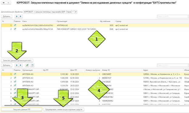 Для проверки работоспособности загрузки, после заполнения в верхней табличной части ключей и организации (круг №1 (Рис.1) можно кнопкой «Загрузить данные ПП» (стрелка №3 (Рис.1)) выполнить загрузку данных с сервера ЮРРОБОТ, при этом будет заполнена данными нижняя табличная часть обработки (круг №4 (Рис.1)), после чего, нажатием кнопки «Сформировать заявки на расходование средств» (стрелка №5 (Рис.1)) выполнить формирование документов по загруженным данным платежных поручений.