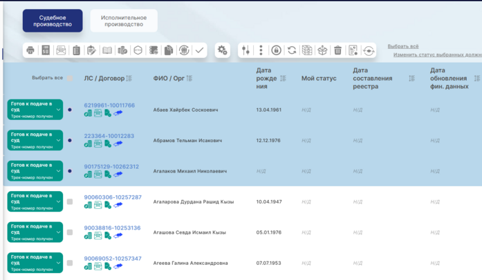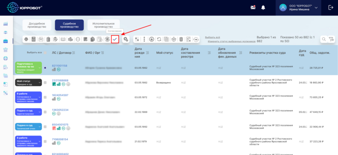 Функция согласования позволяет ускорять работу по подаче в суды выбранных должников, также как и работать с автоматической настройкой отправки в суд и отправкой ЭЗП для согласованных должников.
