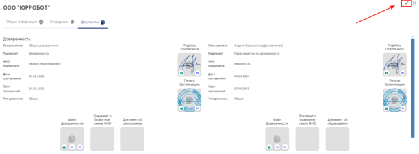 Чтобы добавить сертификат в доверенность, нужно зайти в раздел «Организации» в вашем личном кабинете, в разделе «Документы» переключиться в режим редактирования, нажав на иконку в виде «карандаша» в правом верхнем углу экрана (Рис.8)