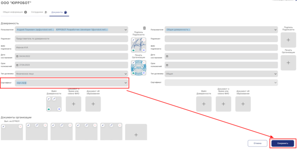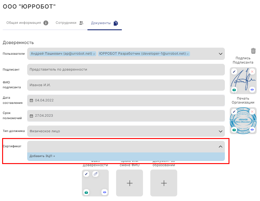 Важно: сертификат, подтверждающий ЭЦП должен быть загружен для сотрудника, который будет подписывать документы посредством ЭЦП.