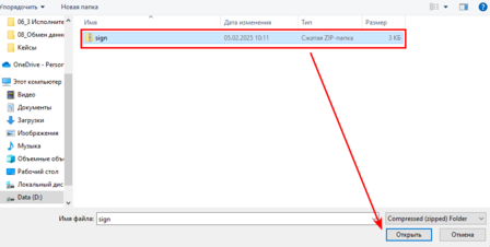 Система предложит выбрать для загрузки файл с сертификатом с вашего компьютера. Нужно выбрать файл в формате .zip и нажать «Открыть» (Рис.11)