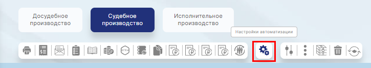 Для настройки автоматической отправки документов, подписанных ЭЦП в судебном производстве в разделе «Работа с должниками» нужно воспользоваться кнопкой настройки автоматизации в панели функциональных кнопок (Рис.14)