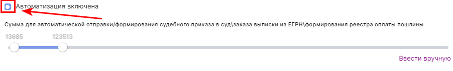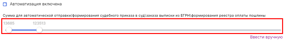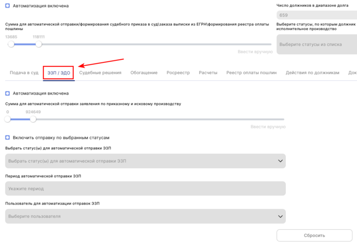 Далее выбрать диапазон сумм задолженности для автоматической отправки / формирования судебного приказа в суд.
