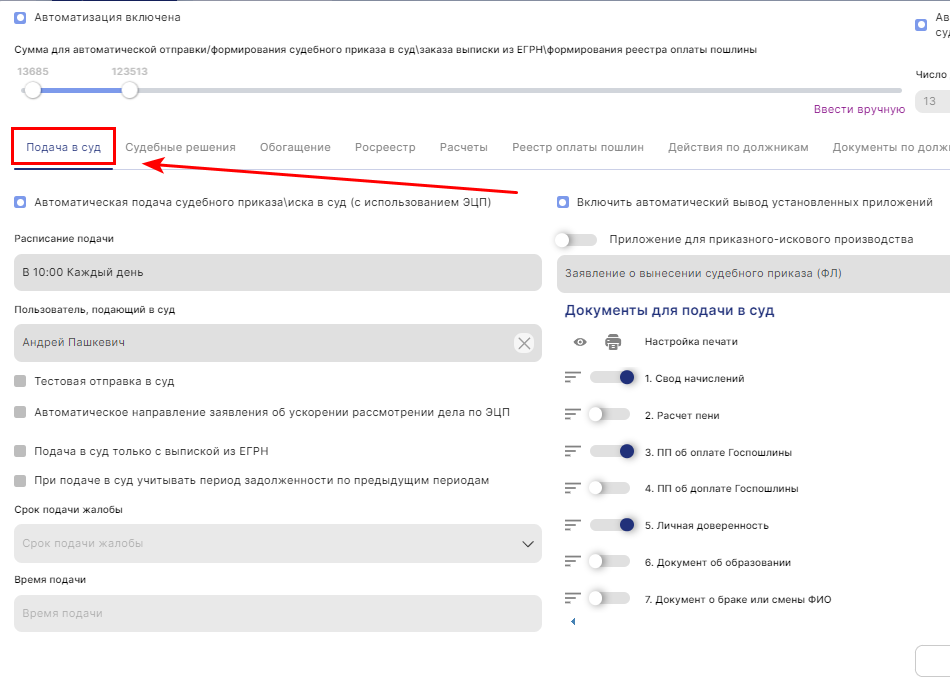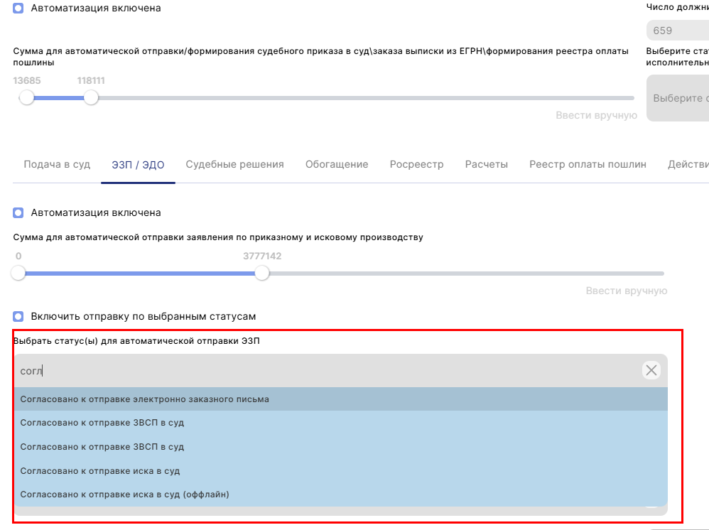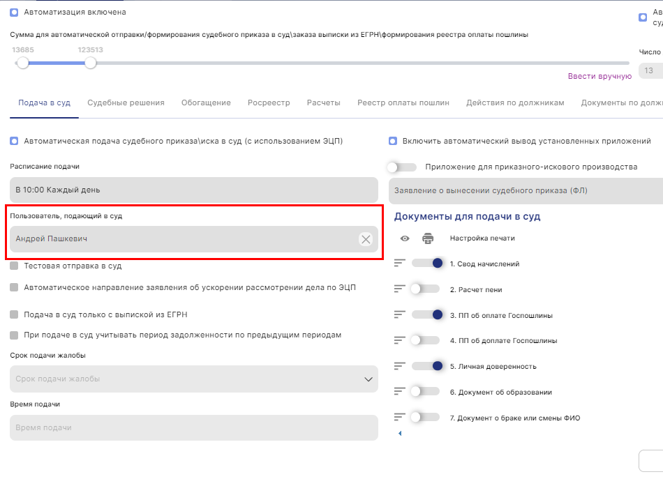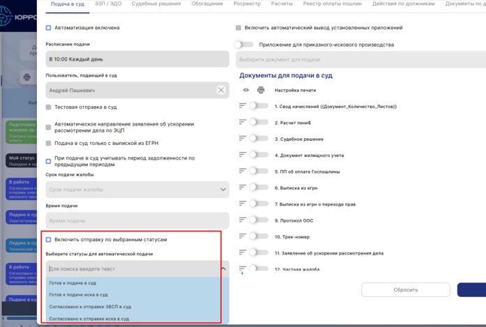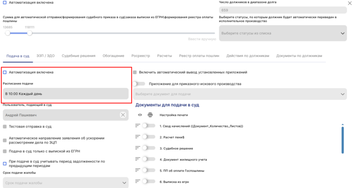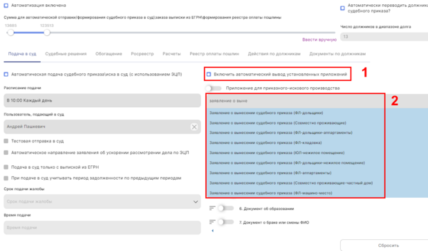 Далее нужно произвести общие настройки автоматизации и настройку автоматической подачи документов в суд в соответствии с выбранным статусом должника