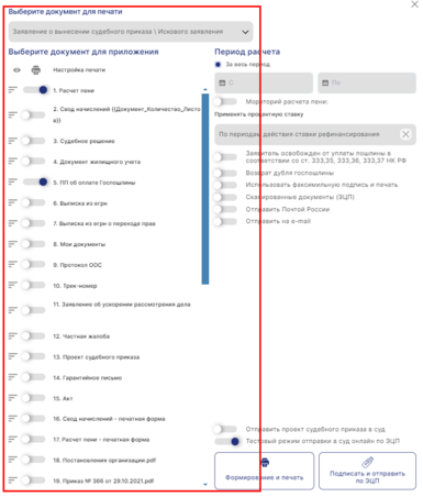 Выбранные приложения будут прикрепляться к основному документу, формироваться пакет документов и отправляться в суд или должнику электронно-заказным письмом.