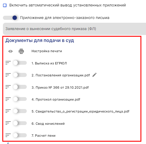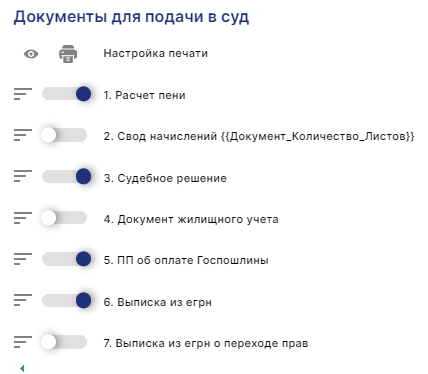 При помощи ползунков можно выбрать документы, которые загружены в Систему и необходимы для подачи в суд в каждом конкретном случае. (Рис.29)