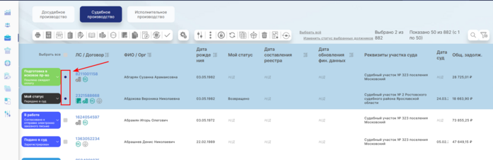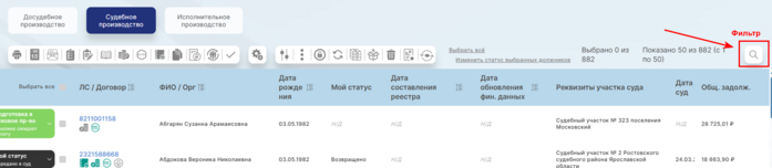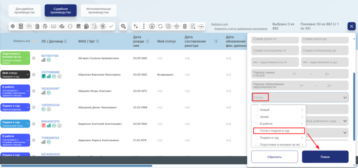 Так как при подаче в суд можно согласовать только должников в статусе "Готов к подаче в суд", в фильтре можно сразу выбрать всех должников с данным статусом (Рис.6)
