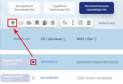 Чтобы сформировать комплект документов, нужновыделить должника(ов) из списка и в меню функциональных кнопок воспользоваться кнопкой «Печать и формирование документов» (Рис.1)