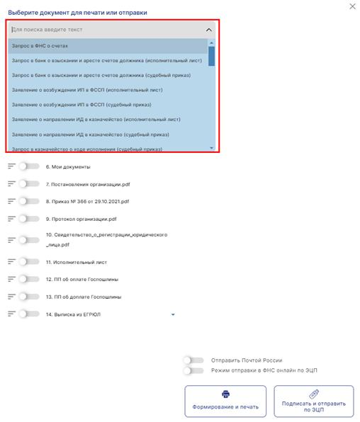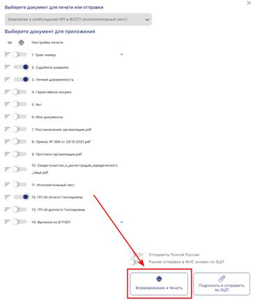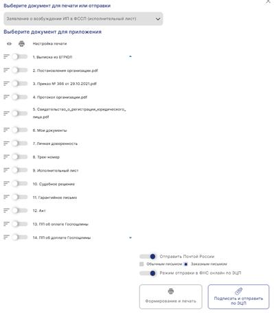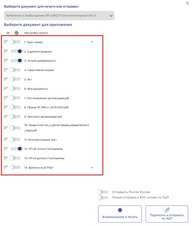 В этом разделе при помощи ползунков можно выбрать документы, которые загружены в Систему и необходимы для отправки в ФССП в каждом конкретном случае. (Рис.4)