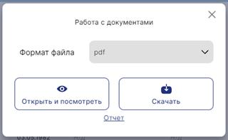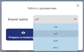 Система предлагает скачать файлы документов в нескольких форматах:pdf, архивzip, jsonилиdocx. Формат файла для скачивания можно выбрать из выпадающего списка и нажать кнопку «скачать». (Рис.9)