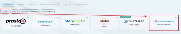 Для работы с этим сервисом необходимо пройти регистрацию на их сайте, зарегистрировать имя отправителя. Затем перейти в систему ЮРРОБОТ в раздел «Уведомления» - «SMS», найти и нажать на виджет компании Stream Telecom. (Рис.1)