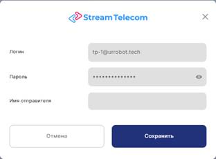 В открывшемся окне нужно ввести логин и пароль авторизации в сервисе Stream Telecom. Информация об имени отправителя загрузится автоматически.                         (Рис.2)