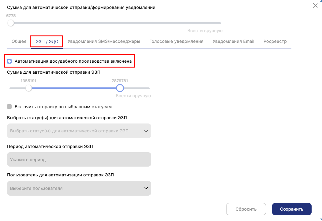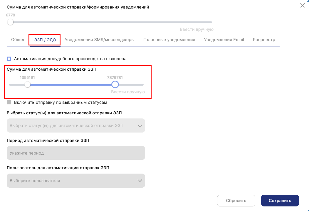 Сумма для автоматической отправки ЭЗППередвигая ползунок влево-вправо нужно выбрать диапазон задолженности, при котором будут автоматически отправляться ЭЗП (Рис.2)