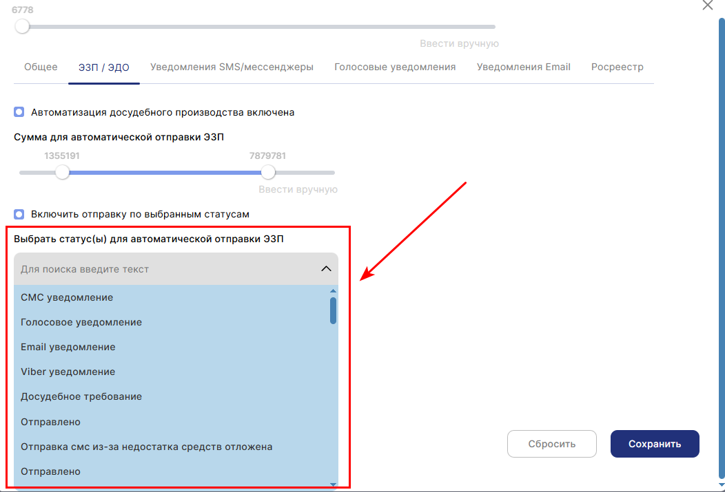 Выбрать статусы для автоматической отправки ЭЗПВ этом меню можно выбрать один или несколько статусов должников для автоматической отправки ЭЗП (Рис.4)