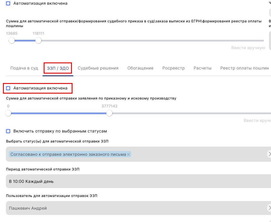 Пользователь для автоматизации отправок-в данном поле выбираем сотрудника, от лица которого будет происходить отправка ЭЗП, ЗВСП /иска в суд по ЭЦП по заданному времени. Для автоматического формирования и подачи в суд по ЭЦП обязательно необходимо указывать сотрудника. Если сотрудник не будет указан, то автоматическое формирование ЗВСП / исков по заданному времени произведено не будет. (Рис.9)