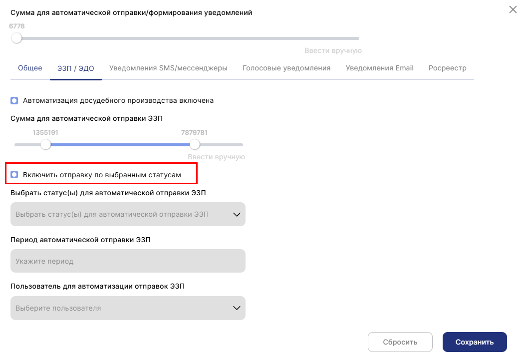 В этом меню можно выбрать один или несколько статусов должников для автоматической отправки ЭЗП