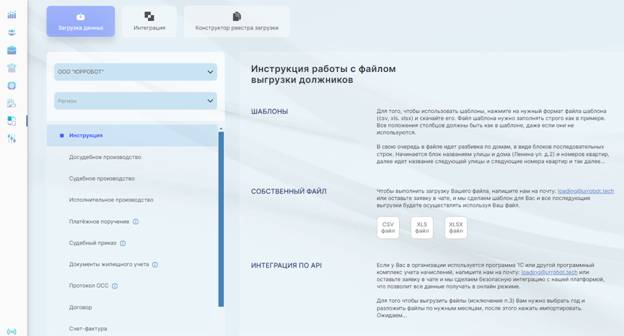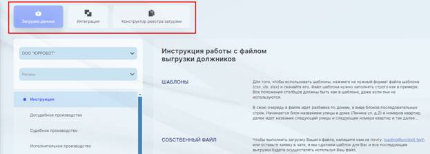 Раздел «Обмен данными» располагается в главном меню личного кабинета Системы. Инструмент позволяет загружать реестр данных должников. Файловый реестр необходим для загрузки данных ПДн должника, контактов, начислений, оплат, перерасчетов и другой информации для работы с должниками. Реестр должников по сути является справочником информации по каждому должнику, которая используется Системой для автоматизации документооборота компании. В частности, для автоматического формирования различных типов документов на основе шаблонов и переменных. Более подробно формирование документов рассмотрено в Разделе «Конструктор документов» Общей Инструкции.  (Рис.1)
