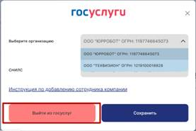 При нажатии на кнопку «Выйти из Госуслуг», происходит удаление учетной записи компании из системы. (Рис.4)