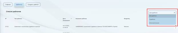 На этой странице представлен список созданных шаблонов, а также шаблонов по умолчанию по каждому типу производства (Досудебное, Судебное, Исполнительное). Выбор типа производства доступен в выпадающем списке в правой части экрана. (Рис.1)