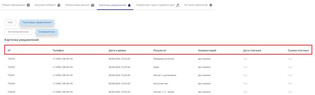Выводится список всех совершенных звонков должнику и результаты по ним.